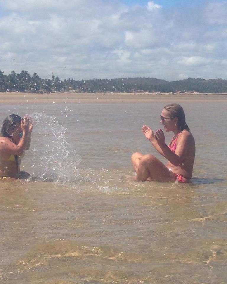 Descrição da imagem para cego ver: Amanda está olhando para o horizonte da praia ao lado da sua mãe. Atrás delas, está uma piscina com água azul com a cor em harmonia com a água do mar.
