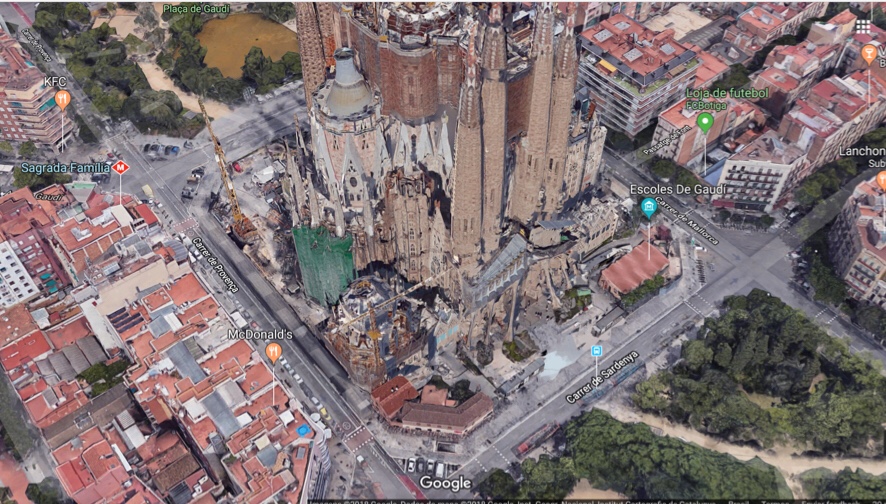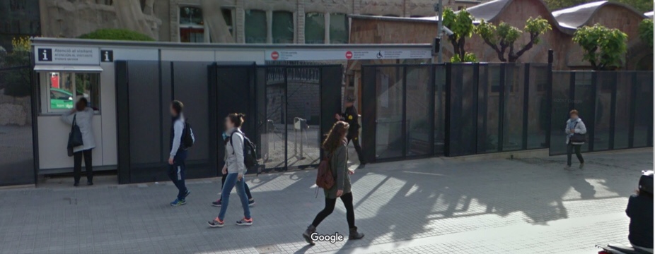Das atrações turísticas de Barcelona, a principal é a igreja da Sagrada Família. A obra projetada por Gaudí no século XIX até hoje permanece inacabada e não se estima sua conclusão para antes de 2026, ano do centenário da morte de Gaudí. A primeira dificuldade que se encontra na Sagrada Família é o acesso: a entrada para cadeirantes é diferente da principal e a sinalização não facilita encontrá-la, restando como última opção perguntar aos funcionários que também não davam uma informação precisa. Para que você não tenha que passa por isso, adianto que a entrada acessível está indicada na imagem abaixo retirada do Google Maps. Pessoas com deficiência não pagam ingresso, nem seu acompanhante. Eu, cadeirante, não tive que comprovar, mas talvez uma pessoa que tenha uma deficiência menos visível tenha mais dificuldade. Mesmo sem pagar ingresso é preciso recolher um ticket na bilheteria para entrada. Caso necessite de um ingresso regular, compre com antecedência ou chegue cedo, pois eles acabam rapidamente.